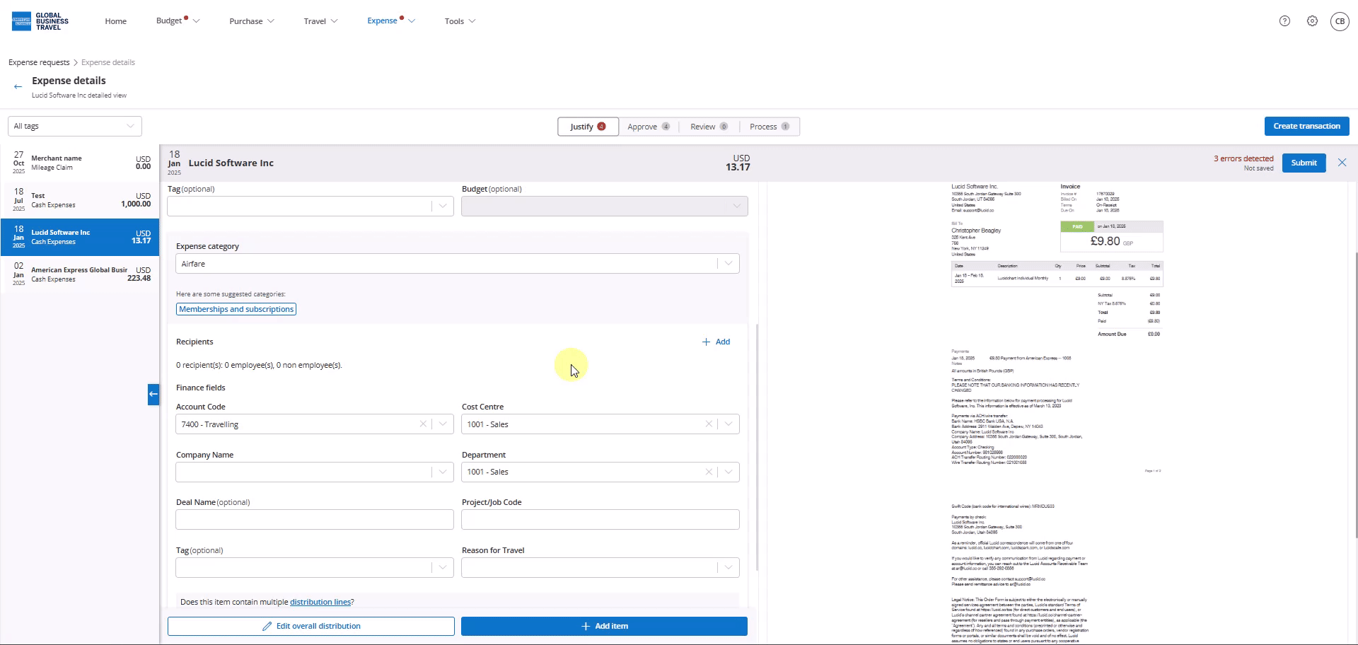 Tip: Upload a receipt as your first step - Amex GBT's spend platform has OCR (optical character recognition), and will auto populate details from the receipt (date, amount, merchant, etc). The receipt is a mandated field and requires a selection from one of 4 options