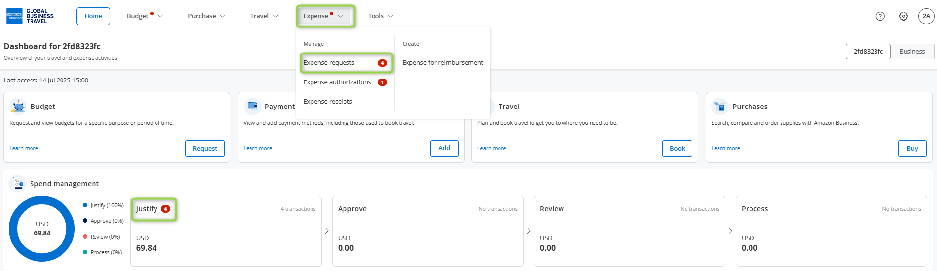 In the 'Spend management' section, click 'Justify' to view expenses awaiting justification.